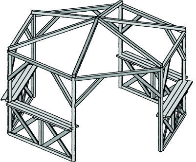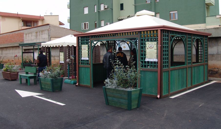 Gazebo quadrati o esagonali, in plastica riciclata Strongplast armato e con scatolato in ferro. i pannelli a maglia quadrata, incrociata o completamente chiusi possono variare in base alle esigenze del cliente. Svariate sono le soluzioni offerte dai pannelli arricchiti con elementi decorativi quali archi e fioriere.