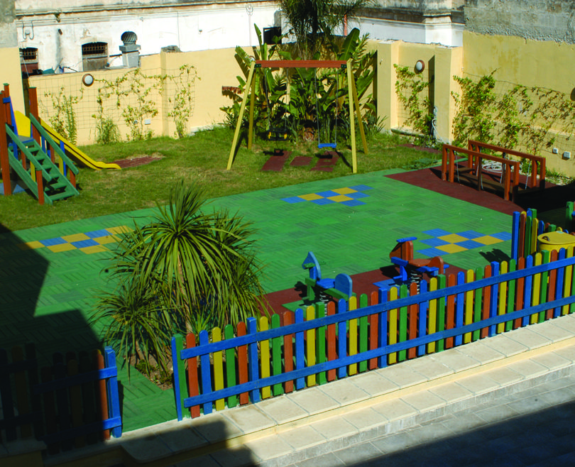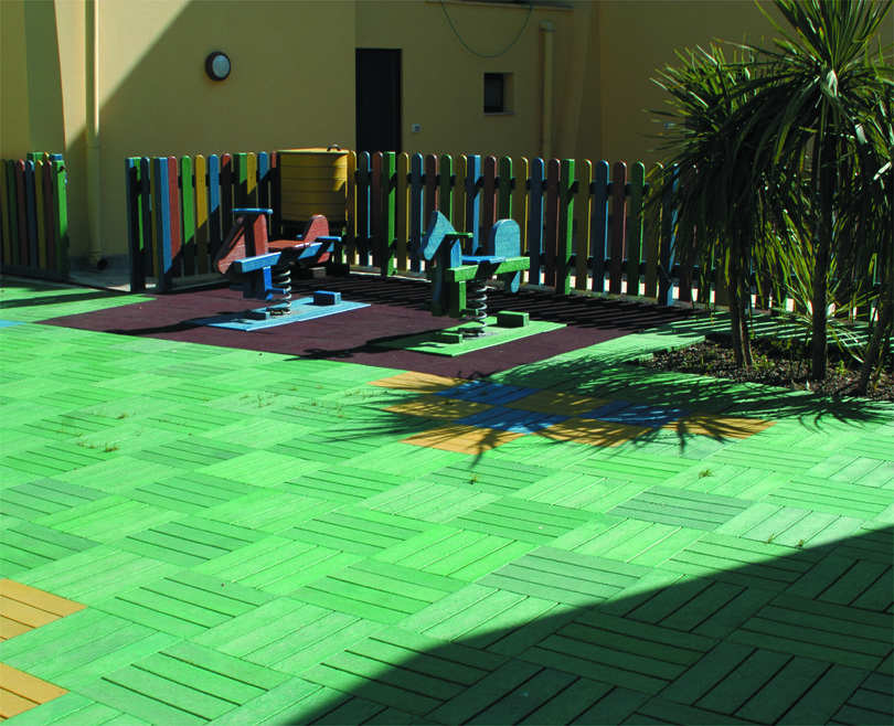 Pavimento per esterno in plastica riciclata Strongplast. Molteplici sono le varianti di colore che danno alla pavimentazione un effetto parquet. La pavimentazione in Strongplast è realizzabile sia in doghe che  quadrotti della misura 41,5×41,5 cm.